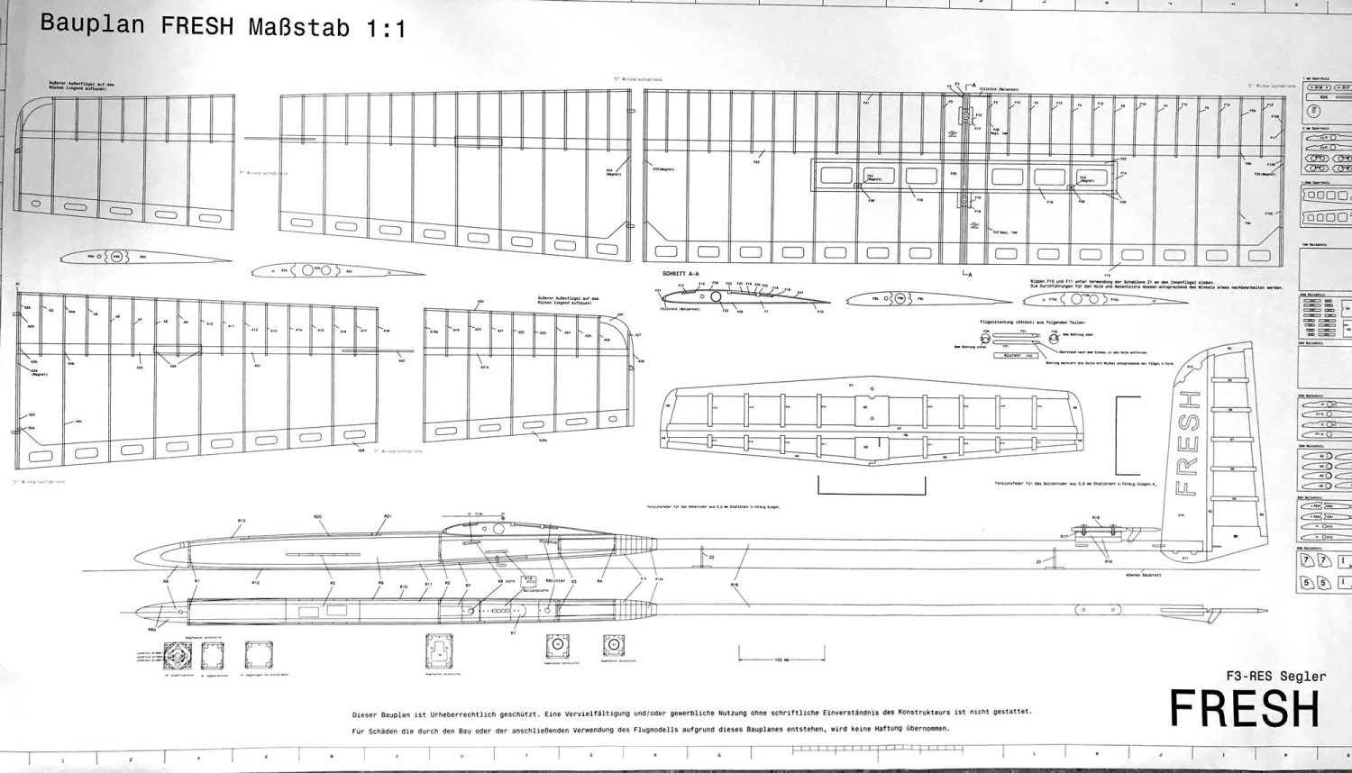 The design is simple, functional and robust. The model combines a very good glide angle with excellent thermal performance and good-natured handling. Although the Fresh was designed to win F3-RES competitions it also makes an excellent sport model. The model comes with two fuselage front formers, alowing it to be built as a pure glder or an electric glider. The electric version is designed for 30 mm spinners and the max internal motor diameter is about 25 mm.